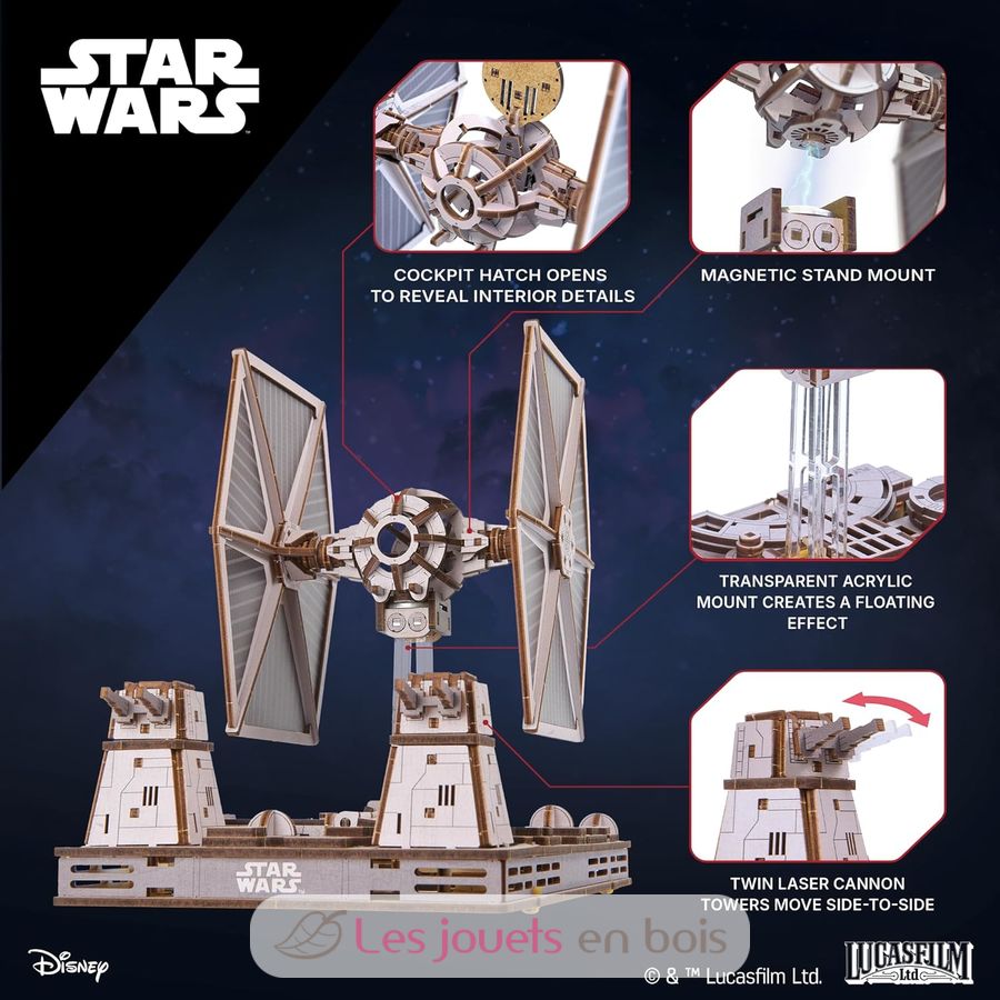 Baue deinen eigenen TIE Fighter mit diesem detailreichen 3D-Holzpuzzle! Mit magnetischem, motorisiertem Ständer im Todesstern-Stil, aufklappbarem Cockpit und beweglichen Laserkanonen.