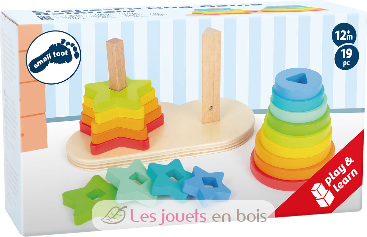 So bunt wie der Regenbogen! Bei diesem Steck- und Stapelspiel gilt es, gleiche Formen der Größe nach aufeinander zu stapeln, dass die Farben des Regenbogens in die richtige Reihenfolge gebracht werden. Beim Stapeln, Stecken und Sortieren lernen Kinder spielerisch verschiedene Formen, Farben und Größen kennen und trainieren feinmotorischen Fähigkeiten sowie Hand-Augen-Koordination. Für das Plus an Sicherheit sorgen die beweglichen Pins!