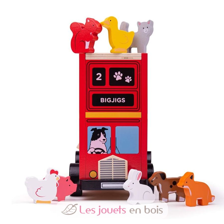 Fahre mit diesem liebevoll gestalteten Bus durch die Stadt und fahre die bunte Sammlung von Holztieren.