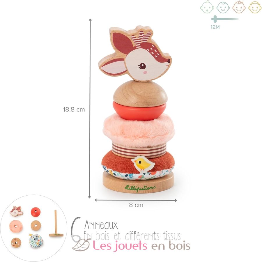 Stapelbares Multimaterial-Spielzeug für Babys! Mit Stella, dem Rehkitz, ist diese Pyramide das ideale Lernspielzeug, um die Motorik zu fördern und Babys ab 12 Monaten zu unterhalten. Hier gibt es keine Größenvorgaben, nur bunte Materialien und Muster zum Entdecken, um die Sinne zu wecken! Mit dem sensorischen Stapelspielzeug kann Ihr Kleines zunächst alle Ringe in die Hand nehmen und ihre Besonderheiten entdecken: Naturholz oder farbiges Holz, Samt- oder Baumwollgefühl, ganz weich, ganz geschmeidig ... Oh! Aber wie lustig ist dieses kleine vogelförmige Etikett! Es ist ein lieber Freund von Stella, dem Rehkitz, der es liebt, ihr beim spielerischen Lernen zuzusehen. Insgesamt 6 Holz- und Stoffelemente werden zu einer Pyramide gestapelt. Natürlich sollte Stellas süßes Gesicht zuletzt platziert werden – für ein „Wow“-Ergebnis! Mit zunehmendem Lernfortschritt wird Ihr Kind Freude daran haben, die Ringe auf dem Holzstab zu stapeln und so seine Feinmotorik und sein Denkvermögen zu entwickeln. Es wird es lieben, alles abzunehmen, alles aufzustapeln und dann wieder von vorne anzufangen! Zusammengebaut ist dieses Stapelspielzeug 18,8 cm hoch. Die Stoffringe dieses Aktivitätsspielzeugs sind bei 30° in der Waschmaschine waschbar. Schenken Sie Ihrem Baby jetzt sein erstes Stapelspielzeug von Lilliputiens!