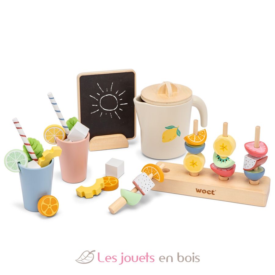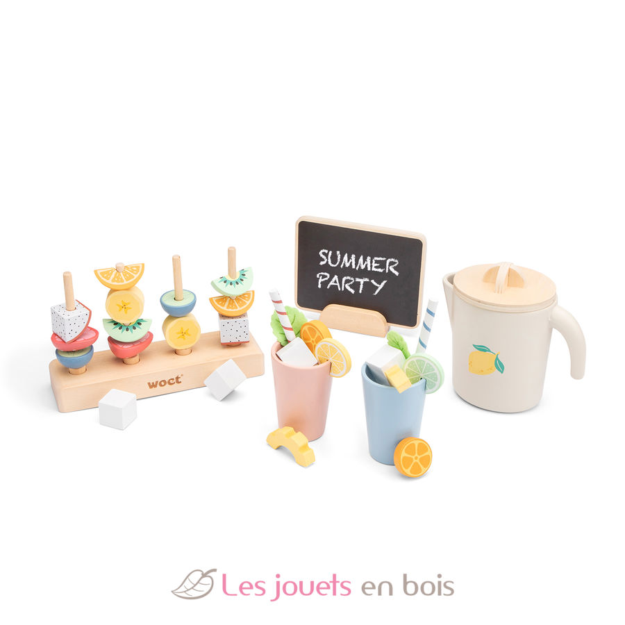 Mach dich bereit für das ultimative Sommer-Spieltreffen! Mit fruchtigen Spießen, frischer Limonade und strahlendem Sonnenschein ist dieses farbenfrohe Holzspielset perfekt für kleine Kinder, die gerne mixen, stapeln und servieren. Ob Saftstand, Picknick oder Café-Spiel an einem sonnigen Nachmittag – dieses farbenfrohe Set weckt die Fantasie Ihrer Kleinen.