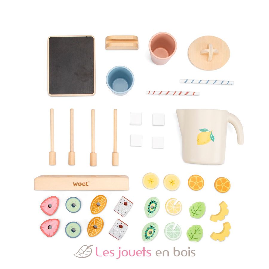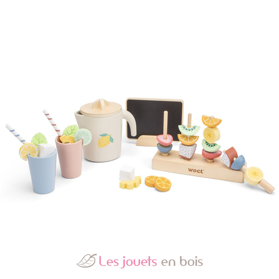Das Set enthält zwei Becher mit fruchtigen Zutaten und Strohhalmen, einen Limonadenkrug mit Deckel, eine Tafel mit Tagesangeboten, vier Holzspieße mit Ständer sowie einen Regenbogen aus Fruchtscheiben für leckere Spielkombinationen. Beim Einschenken, Garnieren und Rollenspiel entwickeln Kinder ihre Feinmotorik, ihre Kreativität und haben endlosen Spielspaß. Eine erfrischende und spielerische Ergänzung für jede Spielküche oder jedes Spielcafé – Guten Appetit! Dieses Spielzeug ist aus 100 % FSC-zertifiziertem Holz gefertigt.