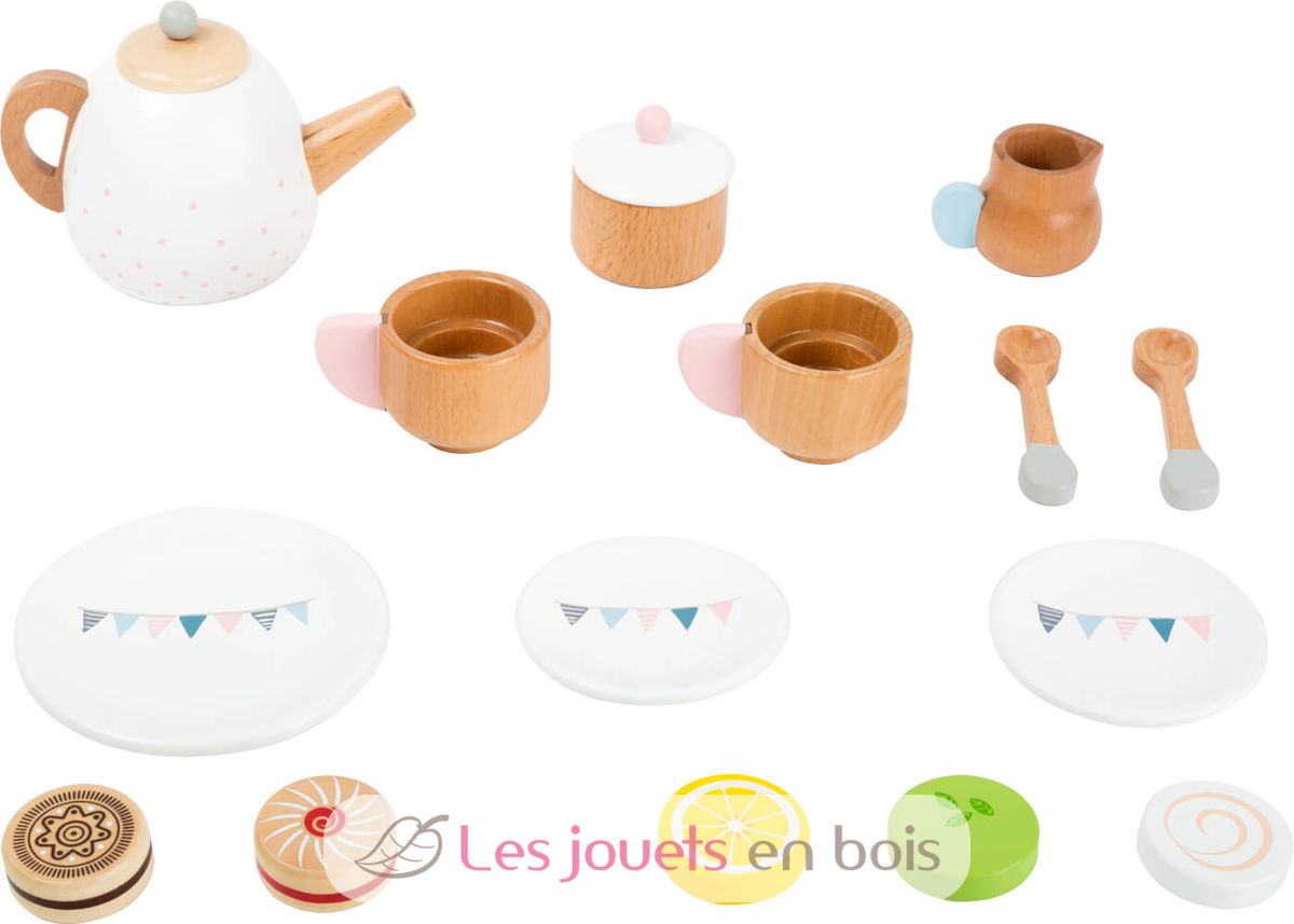 It's tea time! Mit diesem Teeservice aus robustem Holz bleiben keine Wünsche offen. Das Gedeck für zwei Personen mit verschiedenen Teesorten, Milchschaum und Keksen bereichert das Rollenspiel in der Kinderküche. Zwei Löffel zum Umrühren komplettieren das Set. Die Deckel der Teekanne und der Zuckerdose sind abnehmbar.