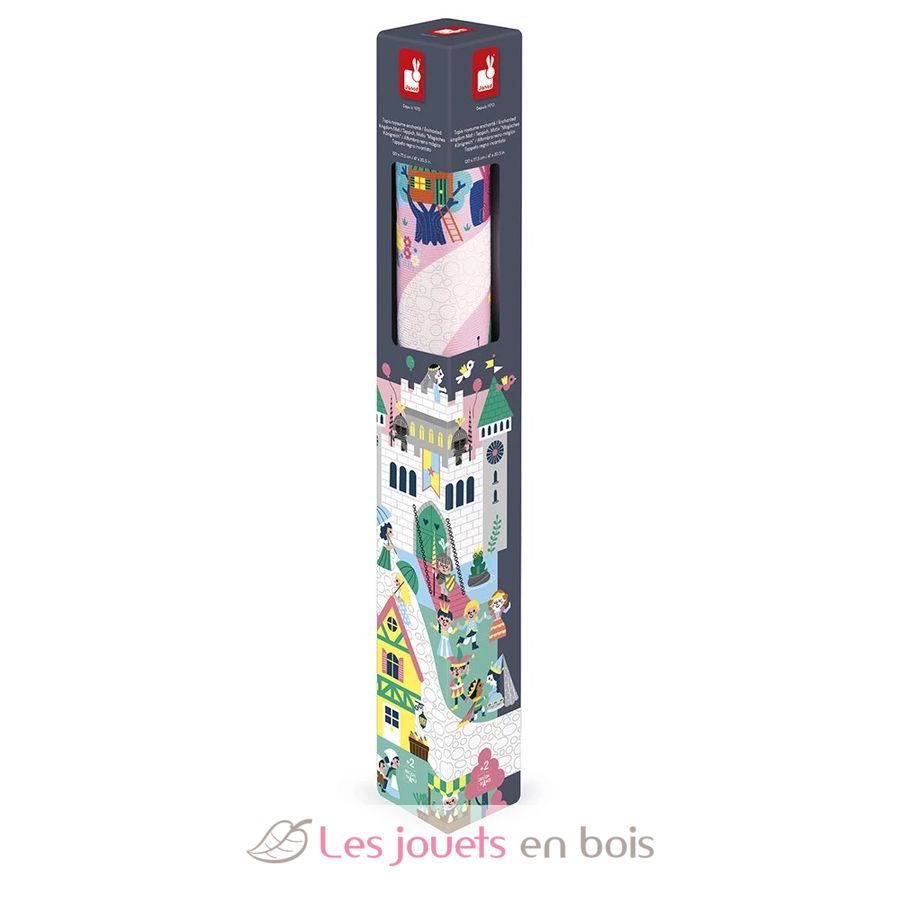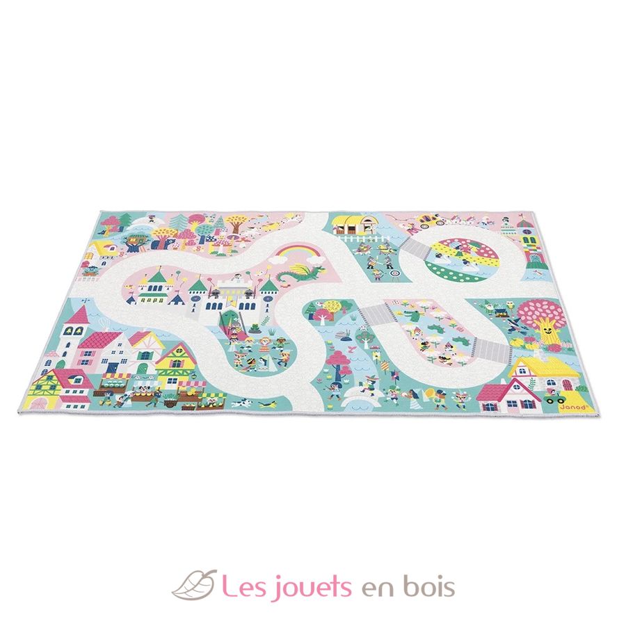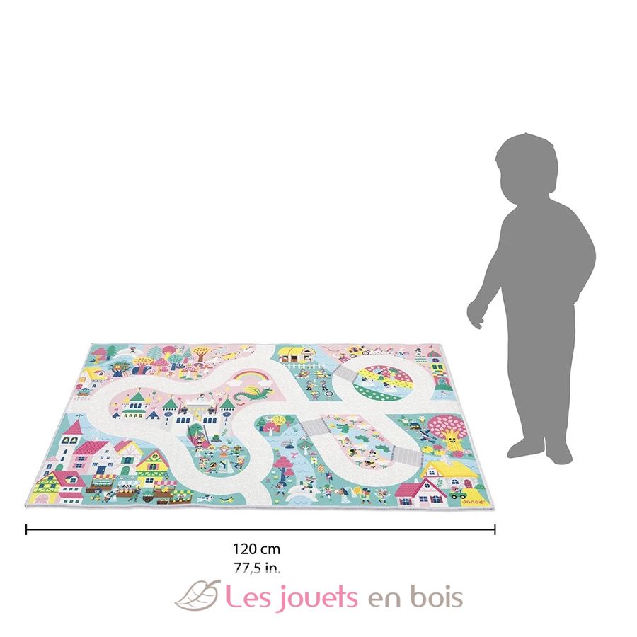 Auf ihrem Spielteppich mit Rennstrecke haben die Kleinen Spaß daran, über Brücken und Wege zu gehen und wie bei einem Such- und Findespiel nach versteckten Elementen zu suchen. Man macht ausfindig, wo sich die Trompete des Königs befindet, die Einhörner galoppieren über die rosafarbene Ebene und man achtet auf den seltsamen Zauberer, der im Wald einen Trank braut ... Es gibt so viele Gebäude, Musikinstrumente und Märchenfiguren, die dargestellt werden! Ein kurzer Höflichkeitsbesuch beim Troll, der neben dem Baumhaus wohnt, und dann geht es weiter zum Ritterturnier, bevor wir uns auf dem Markt mit magischen Zutaten eindecken.