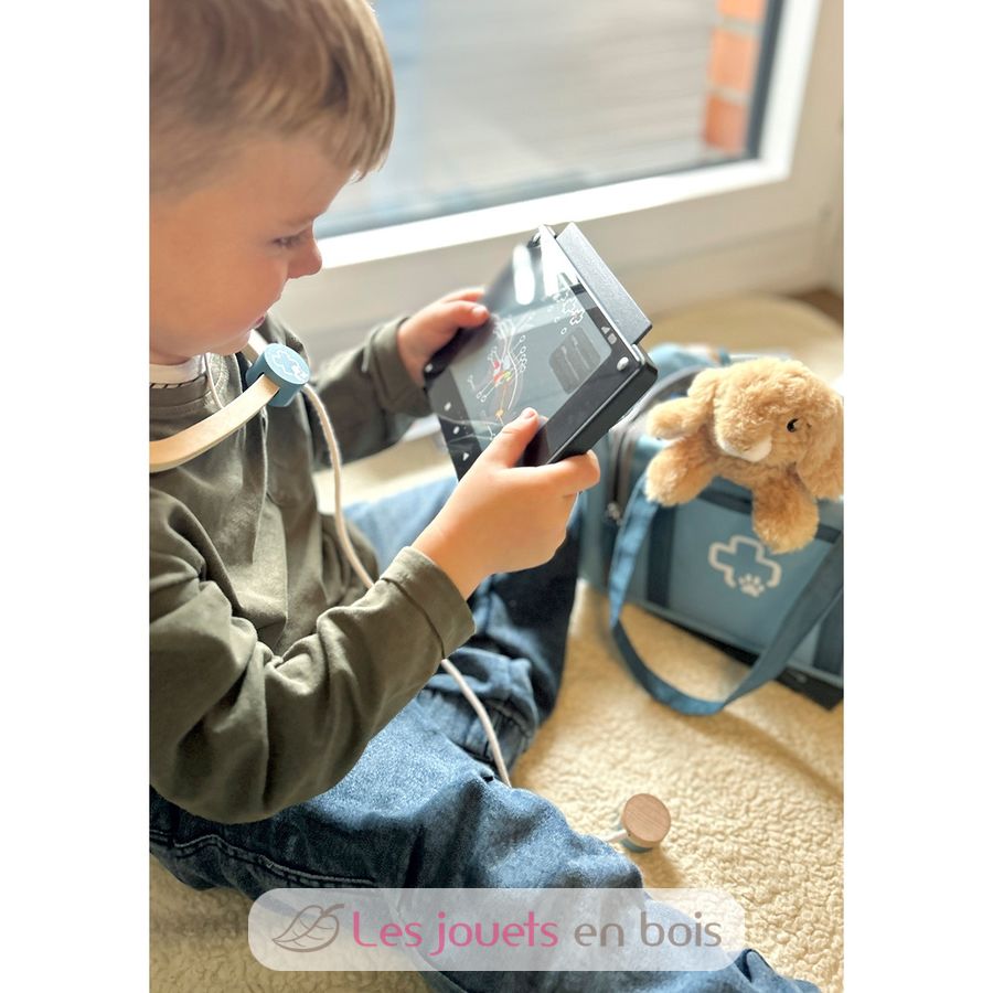 Das umfangreiche Zubehör bietet alles, was kleine Tierärzt:innen brauchen: ein Stethoskop, Fieberthermometer, Otoskop, Spritze, Verband, Schutzkragen und sogar ein Tablet zum Sichten der Röntgenbilder inkl. vier Röntgenbilder (Hund, Katze, Hase, Pferd). Die Röntgenplatten sind zudem auf der Rückseite mit einem Check-up Formular bedruckt. Eine Zeckenzange, eine Pinzette, Medikamente und ein Impfpass runden das Set zusammen mit Terminkarte und Anamnesebogen vollständig ab, während das Din-A5 Poster mit verschiedenen Hunderassen stilecht in der Tierarztpraxis aufgehangen werden kann. Besonders praktisch: Die Tasche dient nicht nur als Transportbox für den Hasen, sondern auch als nützliche Arzttasche, die Ordnung schafft und Mobilität ins Spiel bringt.