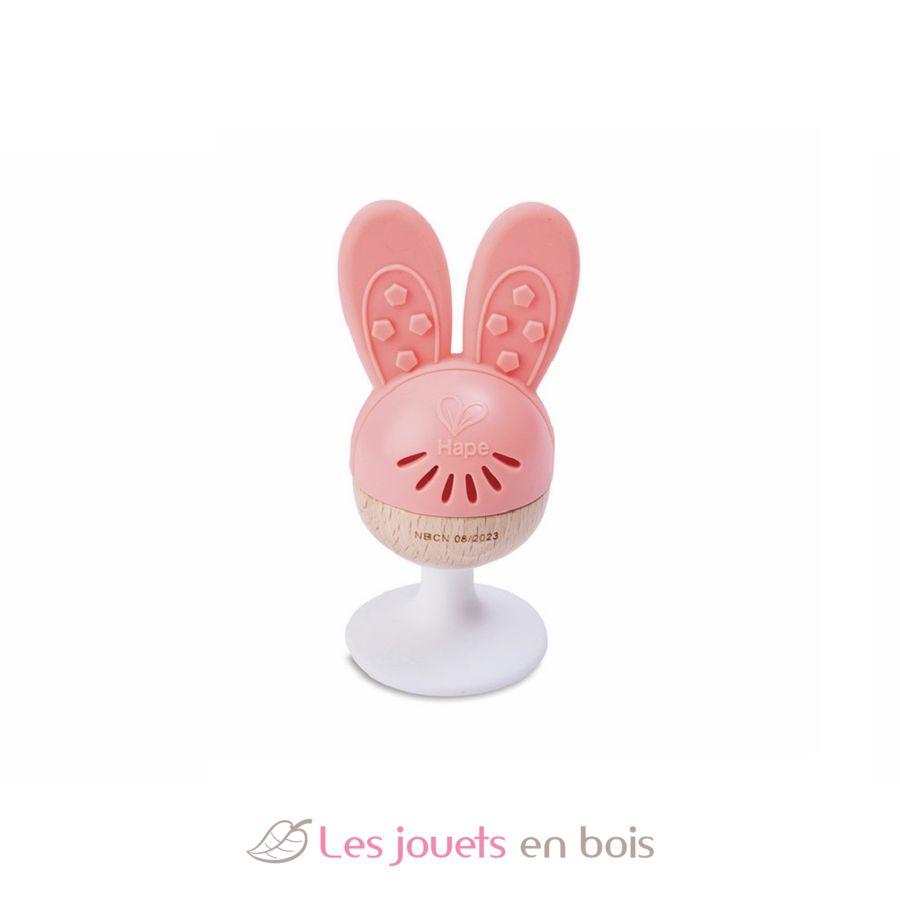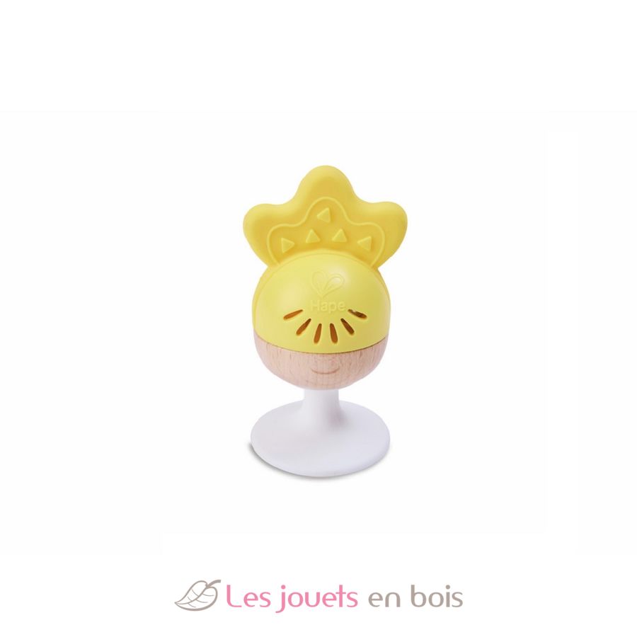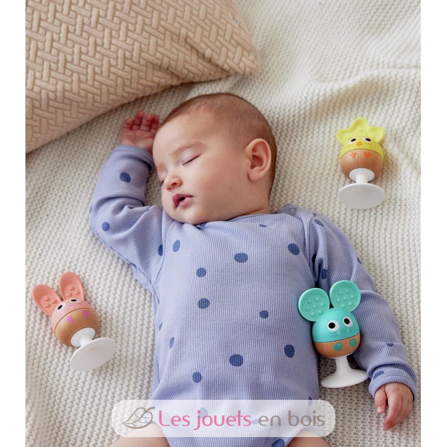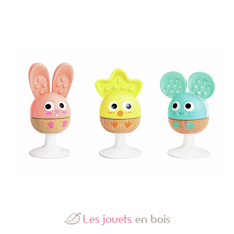 Das Kaninchen, die Maus und das Küken sind aus Holz und Silikon, und lassen sich dank praktischem Saugknopf überall befestigen, wo gerasselt werden soll. Jedes Tier erzeugt andere Klänge.