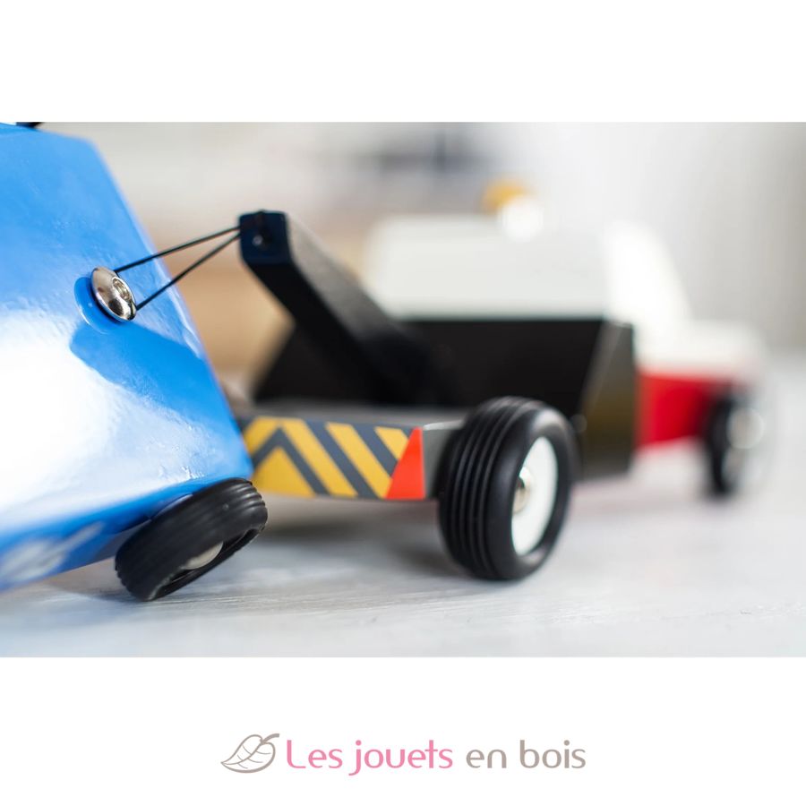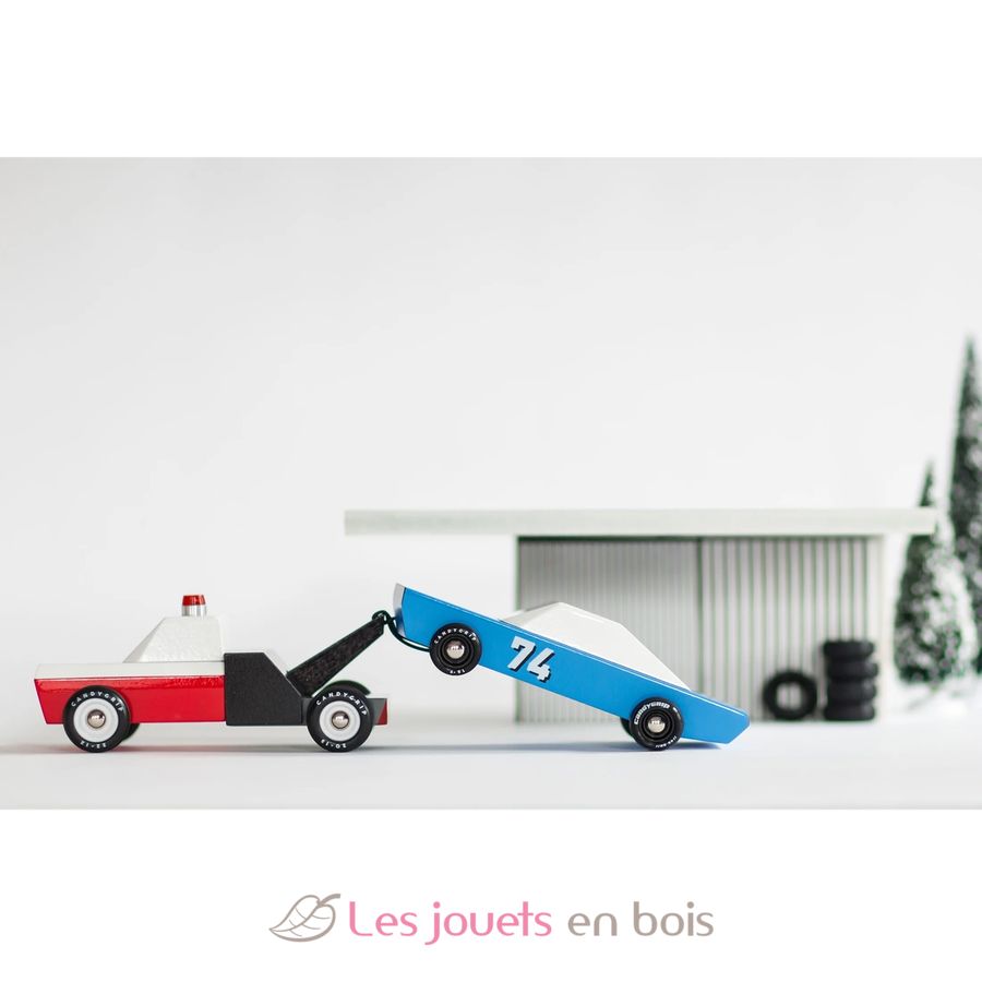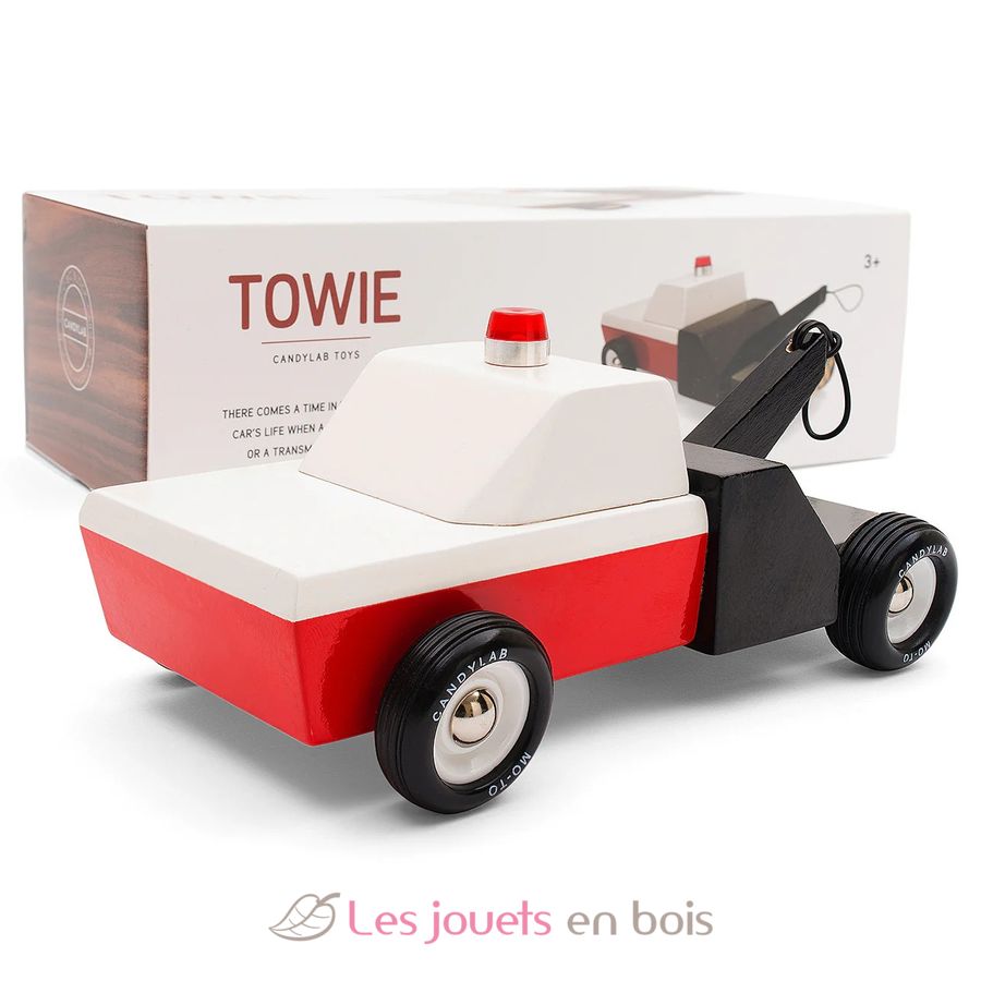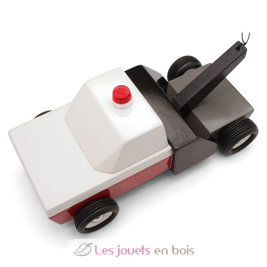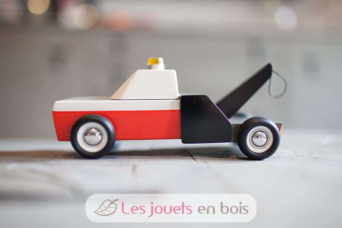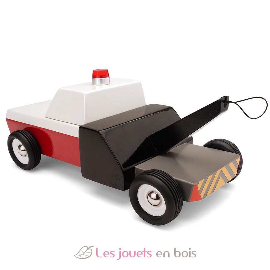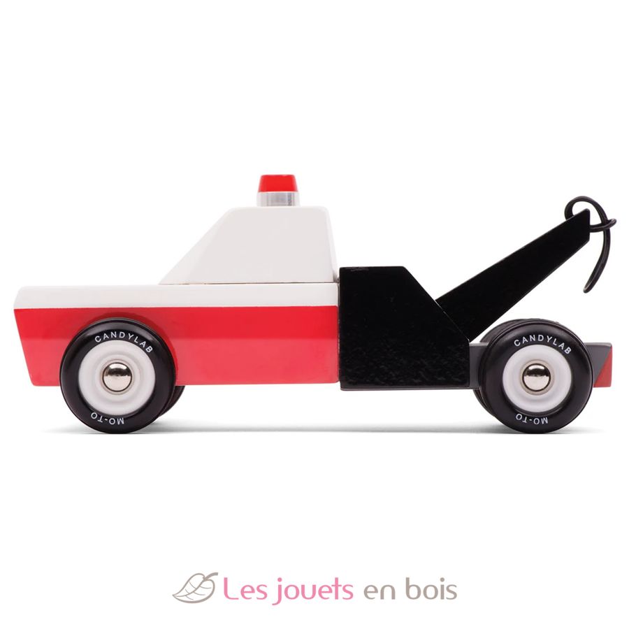 Towie, roter weißer und schwarzer hölzerner Abschleppwagen, Holzauto von Candylab, Ref. M0601.