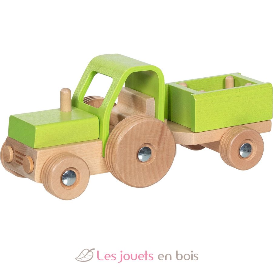 Traktor mit Anhänger grün, Holzfahrzeuge der Marke Goki.