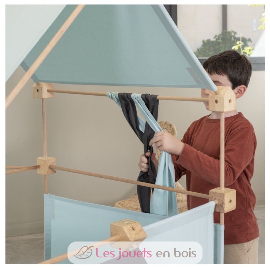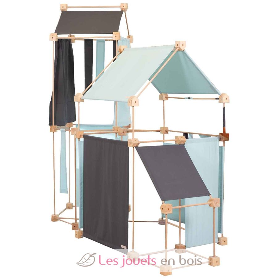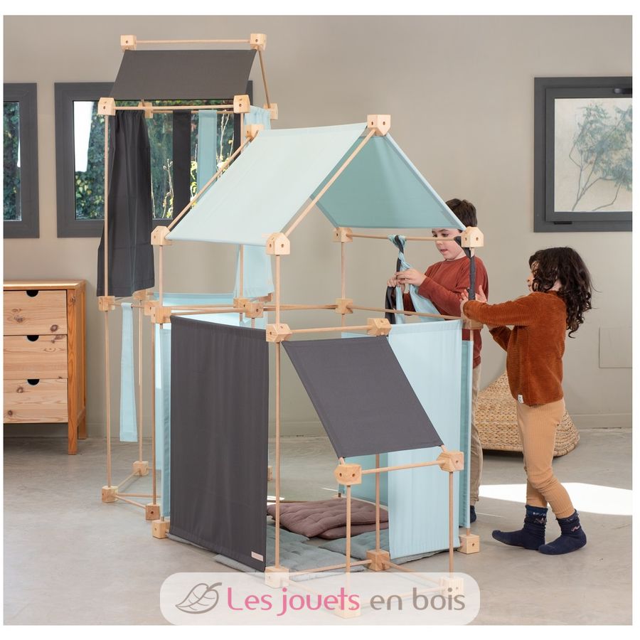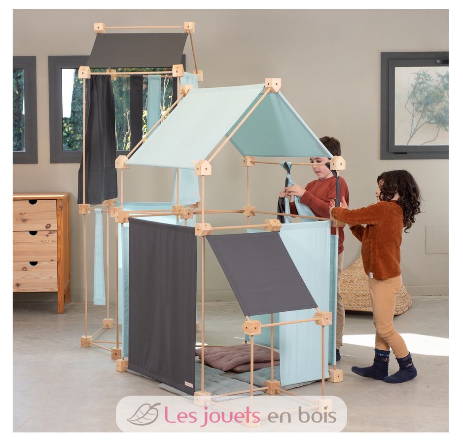 Inhalt : 20 Vierkantklötzchen / 20 Winkelklötzchen / 80 Leisten (4 Längen) / 30 Stoffstücke Bio-Baumwollgewebe. Wird in einer Box aus Hartpappe geliefert.