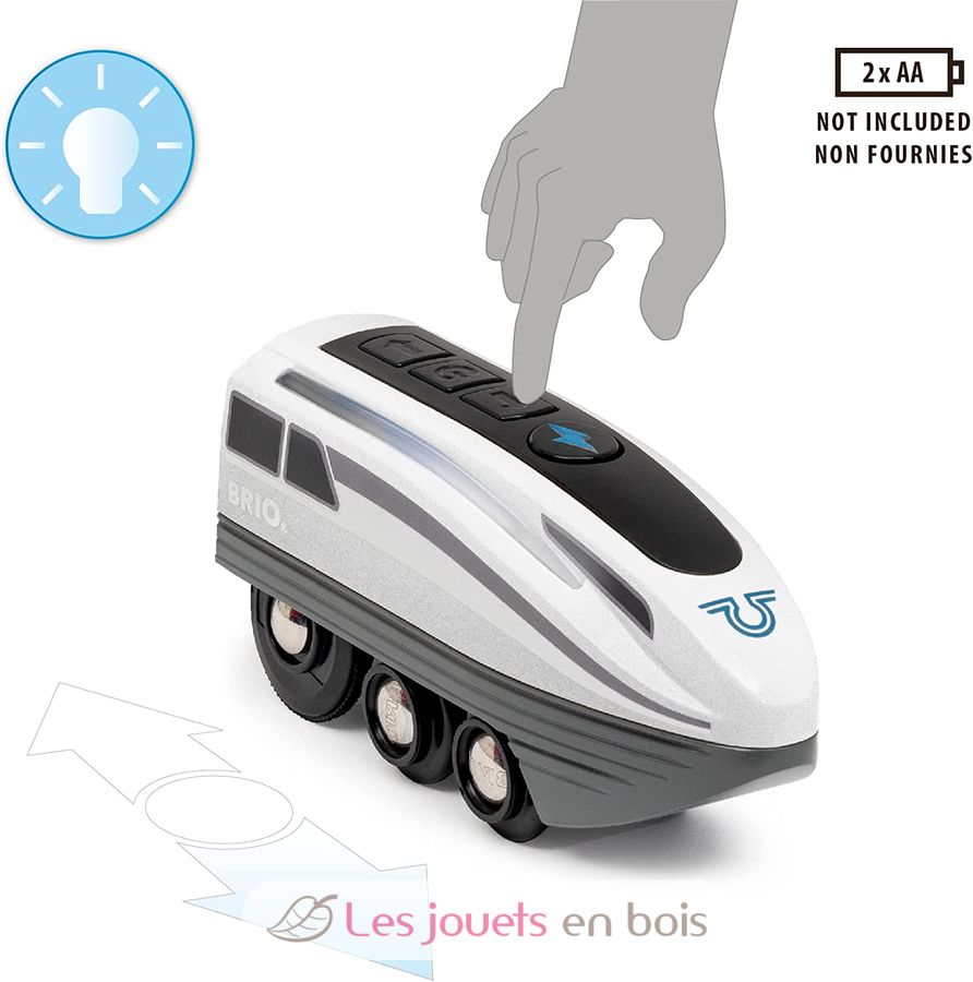 Machen Sie sich mit der superschnellen batteriebetriebenen Lokomotive auf den Weg. Drücken Sie einfach den großen Turbo-Knopf und dieser batteriebetriebene Zug fährt doppelt so schnell und ist damit der schnellste Zug in BRIO World. Der Turbo-Boost dauert 5 Sekunden und wenn der Zug mit voller Geschwindigkeit fährt, werden die weißen Lichter an den Seiten der Lokomotive blau. Diese futuristisch aussehende Lokomotive wird mit einem Waggon geliefert, der einen glücklichen Passagier willkommen heißt, um die Fahrt zu genießen. Ab 3 Jahren.
