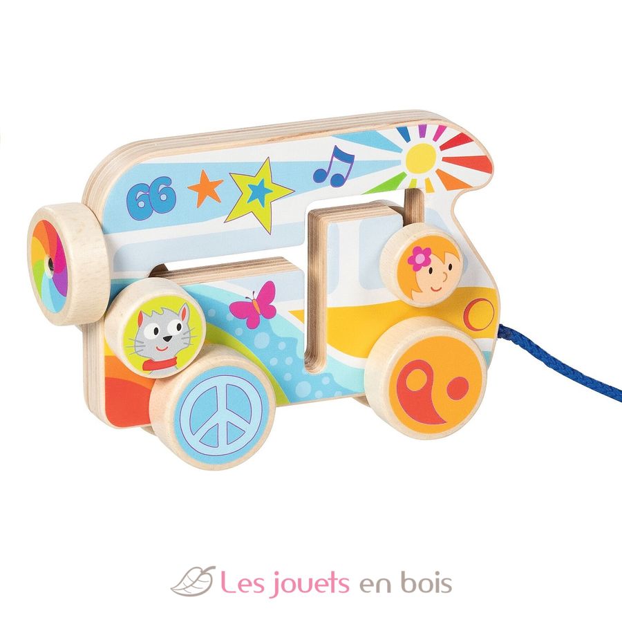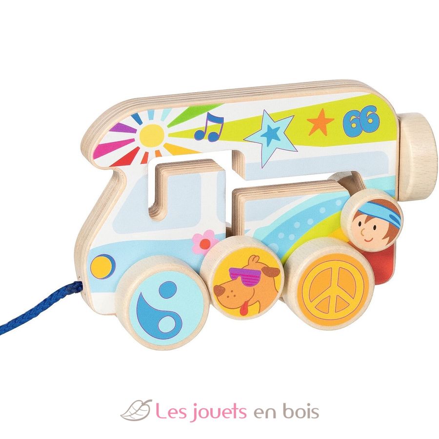 Das farbenprächtige Ziehfahrzeug Camper Van aus Holz wird Dein Kind ermutigen und motivieren, seine ersten sicheren Schritte stolz und selbstbewusst zu gehen.