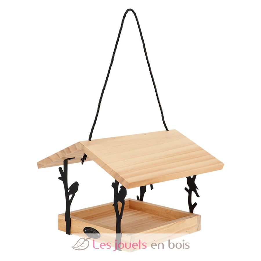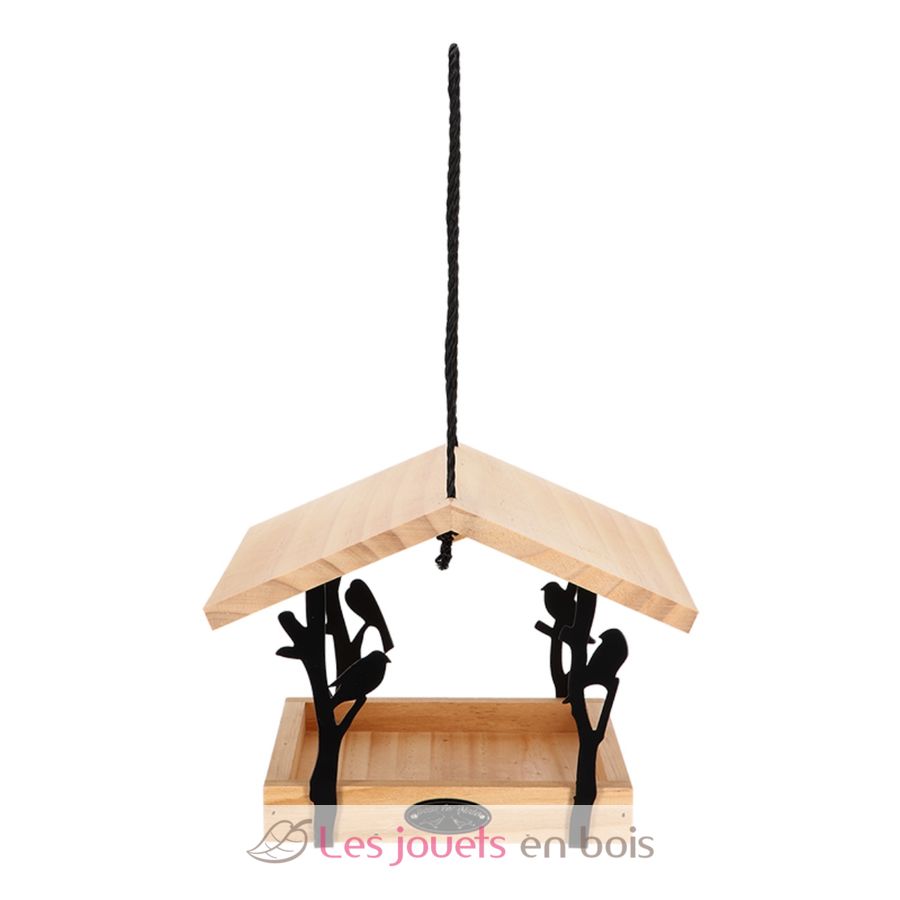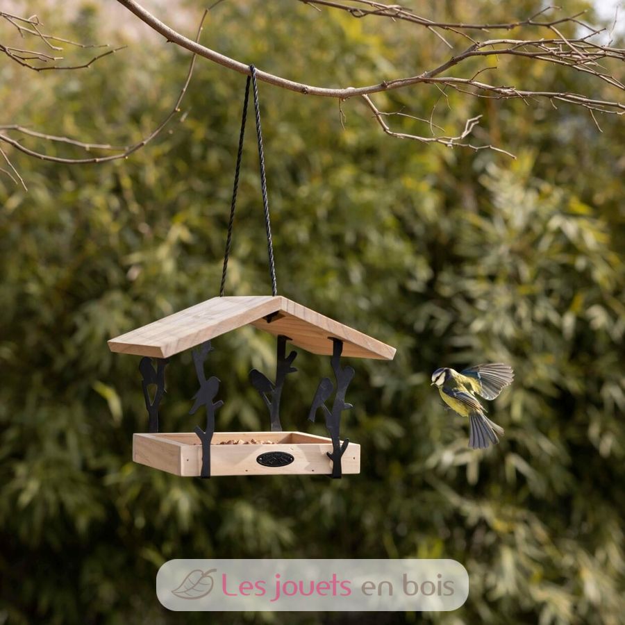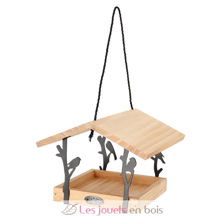 Bei diesem Vogelhäuschen handelt es sich um ein hübsches Futterhäuschen aus Kiefernholz mit dekorativen Metallstäben, die die Silhouette eines Zilpzalps auf Ästen darstellen.