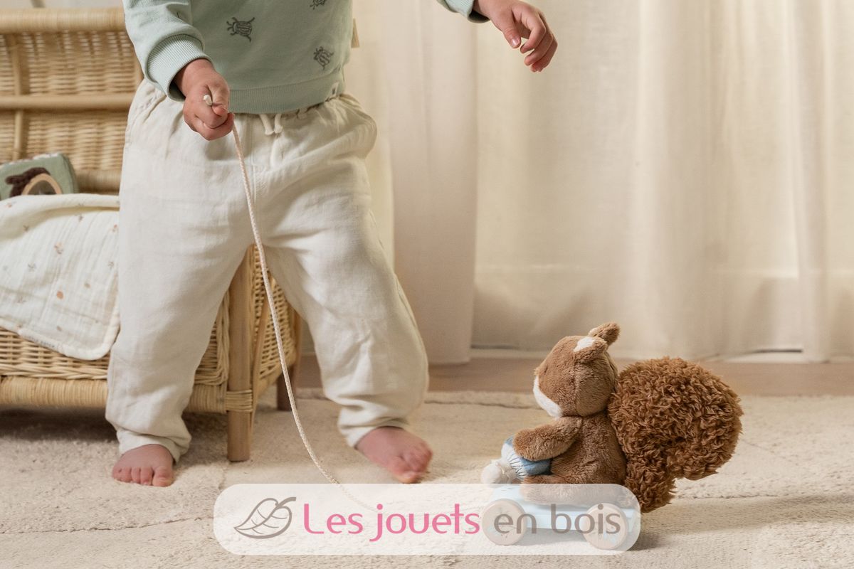 Das weiche und kuschelige Eichhörnchen dieses Nachziehspielzeugs steht auf einem blauen, mit Blättern verzierten Holzwagen. Mit der kleinen Schnur kann Ihr Kind es durch das Haus führen und spielen. Ein niedliches Spielzeug, das zum Laufen anregt und die motorischen Fähigkeiten fördert.