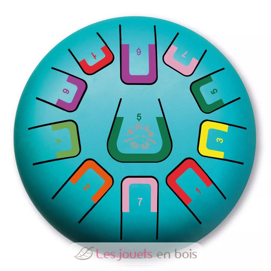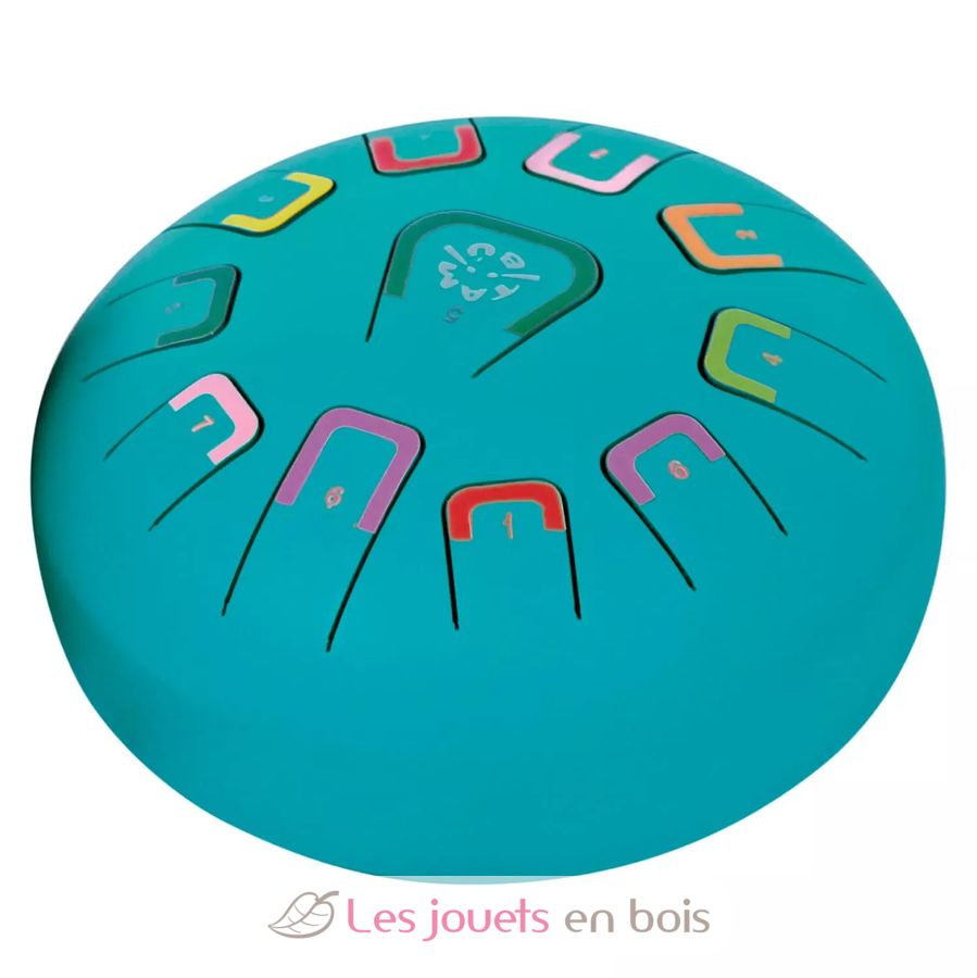 Diese Trommel hat 11 durch Zahlen und Farben unterschiedene Noten, die entspannende harmonische Klänge erzeugen. Es kann auf verschiedene Arten gespielt werden, wobei jeweils eine andere Klangintensität entsteht: mit Stöcken, Fingerspitzen oder Händen.