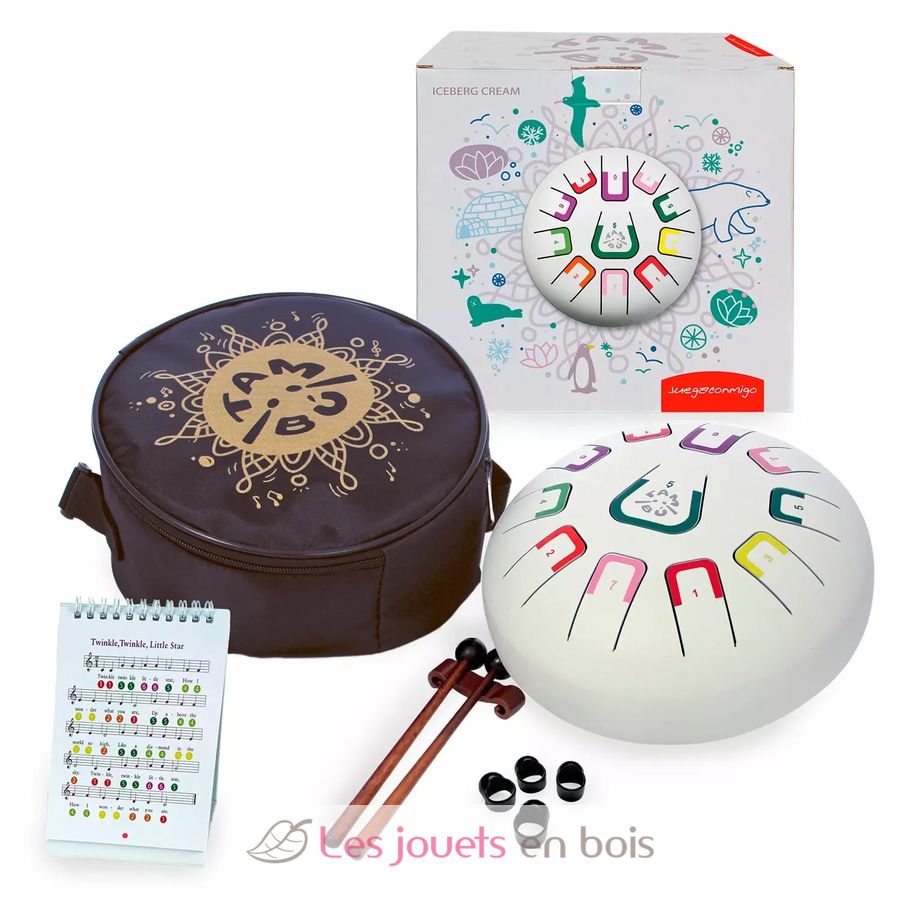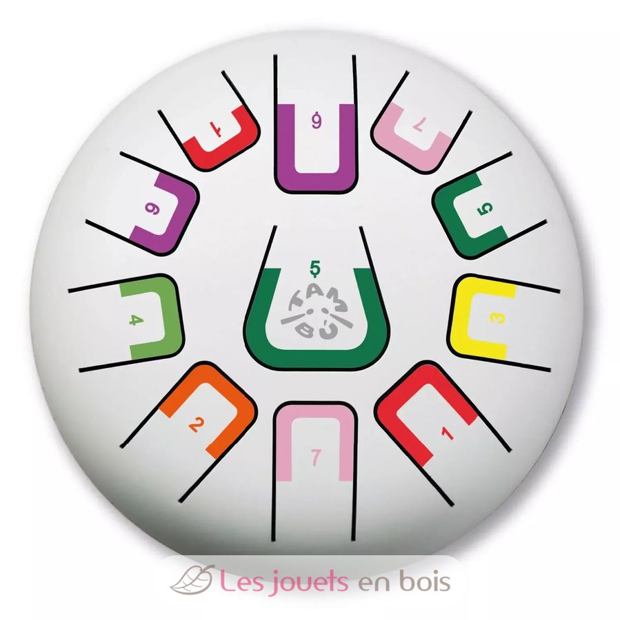 Diese Trommel hat 11 durch Zahlen und Farben unterschiedene Noten, die entspannende harmonische Klänge erzeugen. Es kann auf verschiedene Arten gespielt werden, wobei jeweils eine andere Klangintensität entsteht: mit Stöcken, Fingerspitzen oder Händen.